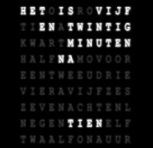 Deze klok heeft geen wijzers, maar geeft de tijd aan met lettertjes. De lettertjes vormen woorden en die geven dus de tijd aan. BEWERKEN 2016-12-04