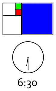 De uren (rood en blauw): 5 + 1 = 6 uur. De minuten (groen en blauw): 5 + 1 = 6. Maal 5 = 30 minuten. Het is dus 6:30.