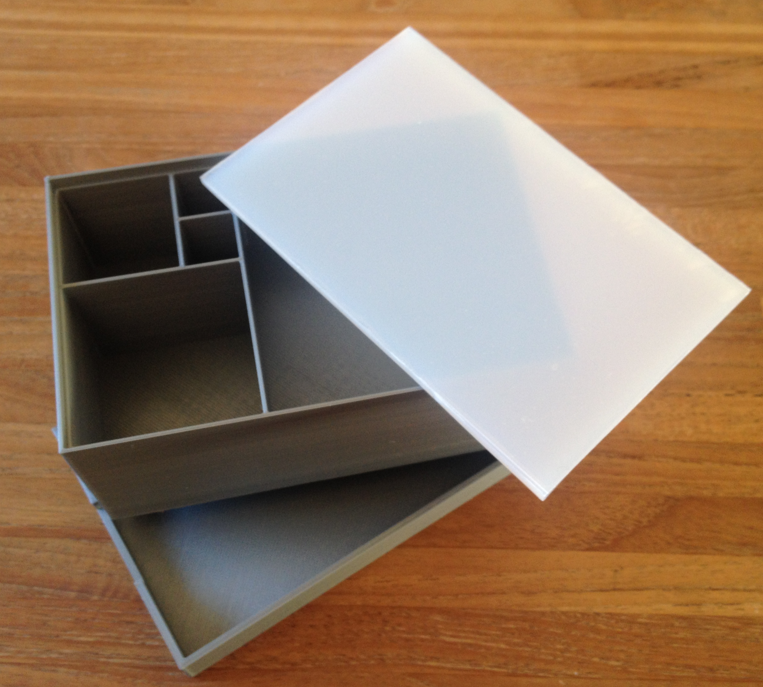 In een houten doosje heb ik een aantal schotjes geplaatst zodat er 5 vierkantjes ontstaan met elk hun eigen waarde. De waarde in de reeks van Fibonacci dus! 1, 1, 2, 3 en 5. In elk van de vakjes komt een aantal LED’s, in totaal 9 stuks. De uren worden aangegeven in rood, de minuten in groen. Wanneer beide van toepassing zijn wordt het vakje blauw. Alle vlakjes bij elkaar opgeteld geeft 12. Voor de uren is dat genoeg, maar voor de minuten natuurlijk niet, daarom moet het aantal minuten vermenigvuldigd worden met 5: maximum is dus 12 x 5 minuten is 60. Zo, dat is dan opgelost. Een paar voorbeelden.