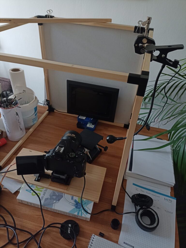 Eigenlijk is het een kubusvormige ministudio waar de camera een vaste plaats heeft op de macrorail, waarbinnen het licht volledig onder controle is, met reflectoren, diffusers en achtergronden.