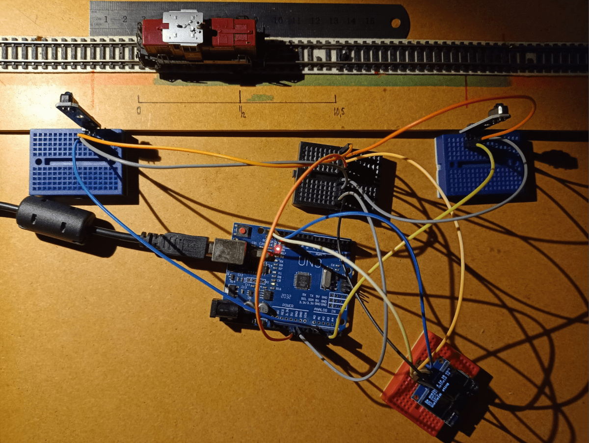 Twee van deze modules, aan een Arduino geknoopt, langs de rails met een bepaalde afstand X daartussen. De eerste module detecteert de loc, daarna wordt de loc door de tweede module gedetecteerd. De tijd die daartussen zit wordt geregistreerd in ms. Dat is alles! Een OLED-schermpje laat de resultaten zien.