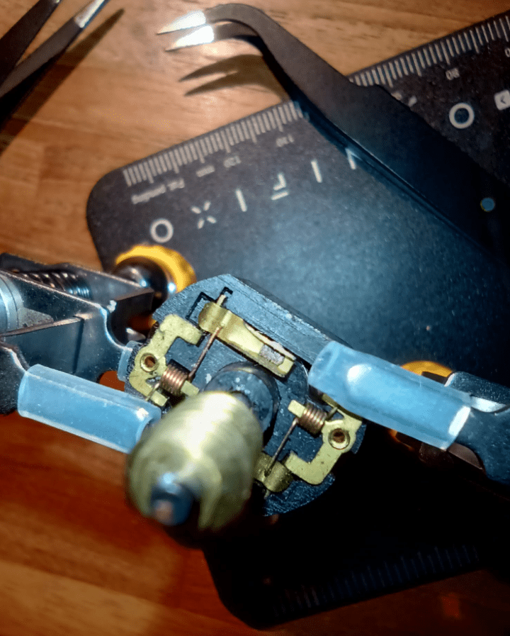 Tijdens de ontmanteling van het opgeofferde loc-je (ergens 3 jaar geleden) was bij het loshalen van de motor een van de koolborsteltjes, inclusief klemmetje, losgekomen: grootte van de koolborstel ca. 1,5 x 1 mm. Terugplaatsen was even een priegelwerkje, maar dat is uiteindelijk gelukt. Hieronder zie je het motortje ingeklemd in de klemmen van mijn nieuwe “derde-handje” de Omnifixo. Een ongelooflijk handig gereedschap!