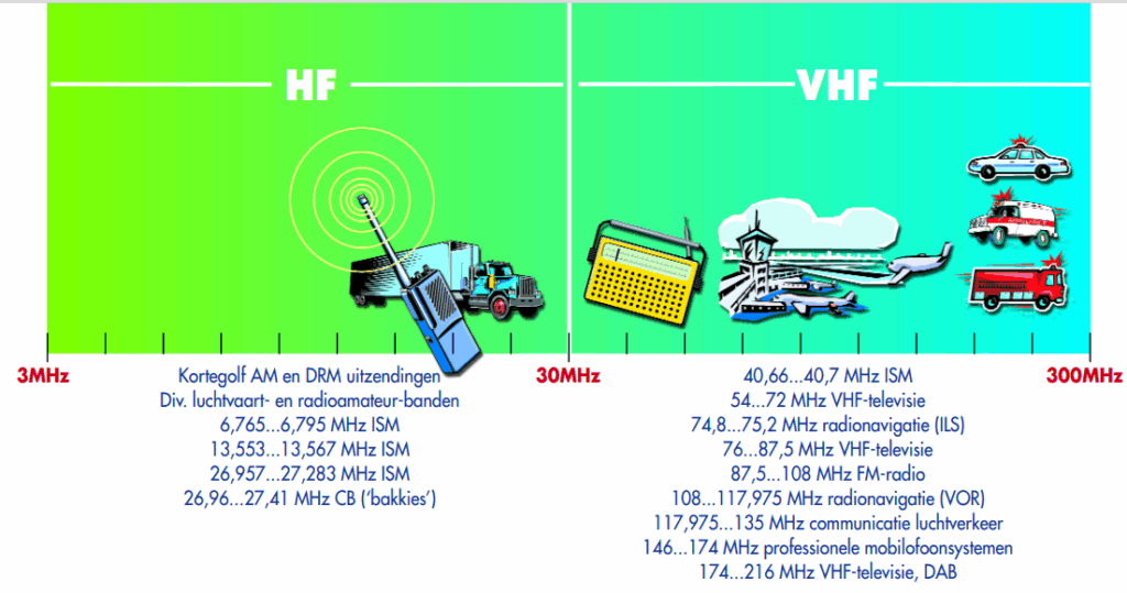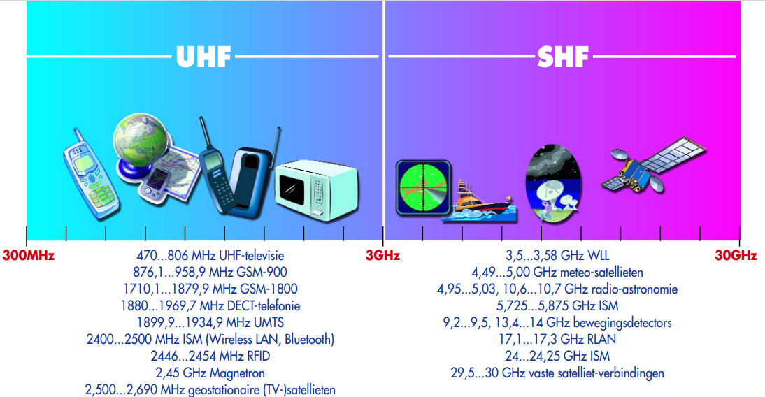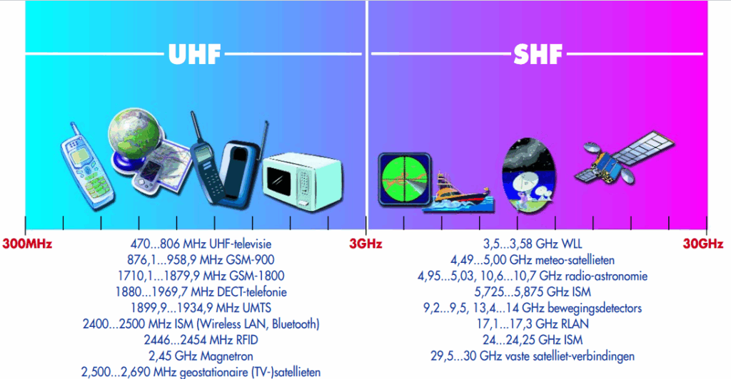 De volgende plaatjes zijn gekopieerd uit een artikel “Het spectrum in beeld” uit het Elektor magazine (2/2004). Dat is al een tijdje geleden en er zullen best wel wat toepassingen (in bijbehorende frequenties) bijgekomen zijn. Maar voor een overzicht is het een goede indicatie. TinyGS kan ik dus in het UHF-segment plaatsen.