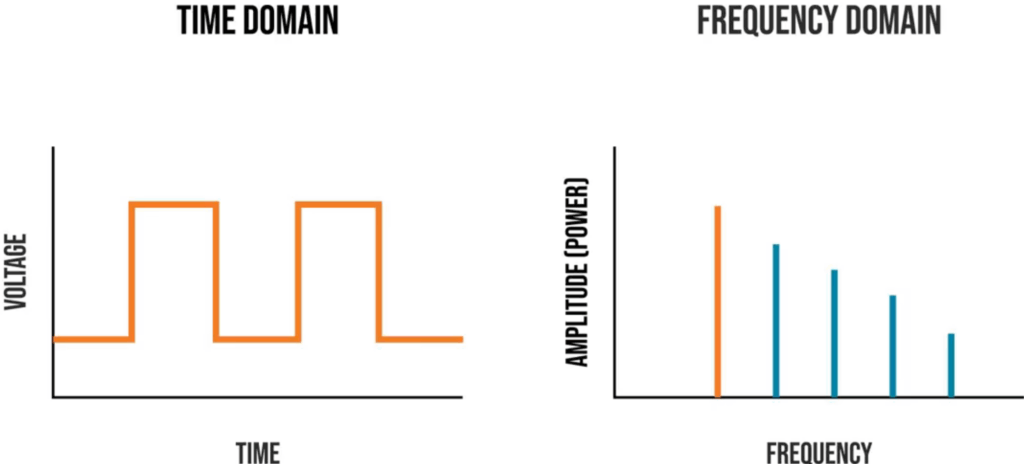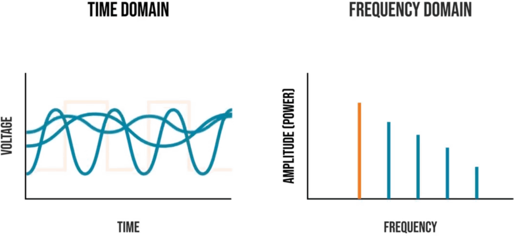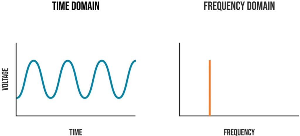 Een sinussignaal heeft een bepaalde frequentie en die kan je tonen op een spectrum analyser. Links zie je hoe het signaal in de tijd verandert; op en neer en weer op en neer enzovoort. Rechts zie je een lijn op de plek van de frequentie van het sinussignaal.