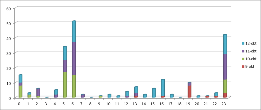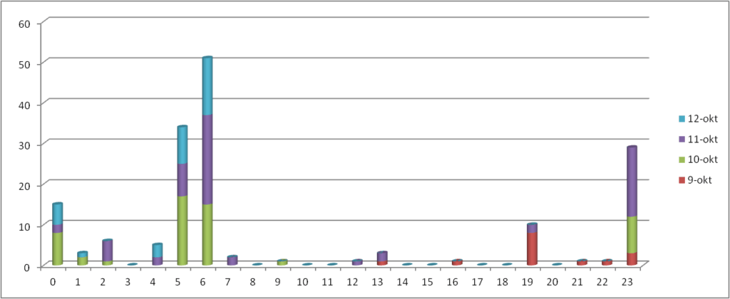 Bovenstaand grafiekje laat de resultaten zien na 3 en een halve dag (de antenne staat nog steeds buiten). Vanaf 9 oktober tot de 00:00u op de 13e in totaal 210 pakketjes ontvangen. Opvallend is de onregelmatige verdeling van ontvangst: flinke uitschieters in de vroege ochtend tussen 5u en 7u en tussen 23u en 1u ’s nachts.