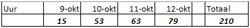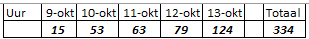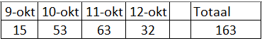 Op 9 oktober is het allereerste pakketje om ca. 13u binnengekomen, de laatste meting die hier verwerkt is is van de 12e oktober, tot ca. 7u. Dus alleen de 10e en de 11e gegevens van een hele dag verzamelen.